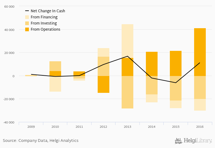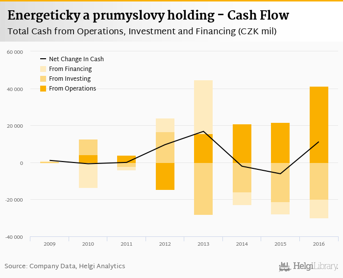 Cash from financing amounted to CZK -10,002 mil, so the company generated CZK 11,192 mil net cash in 2016.