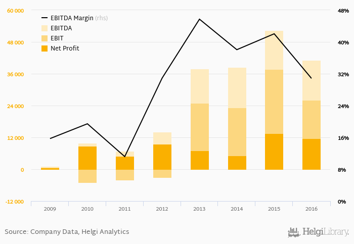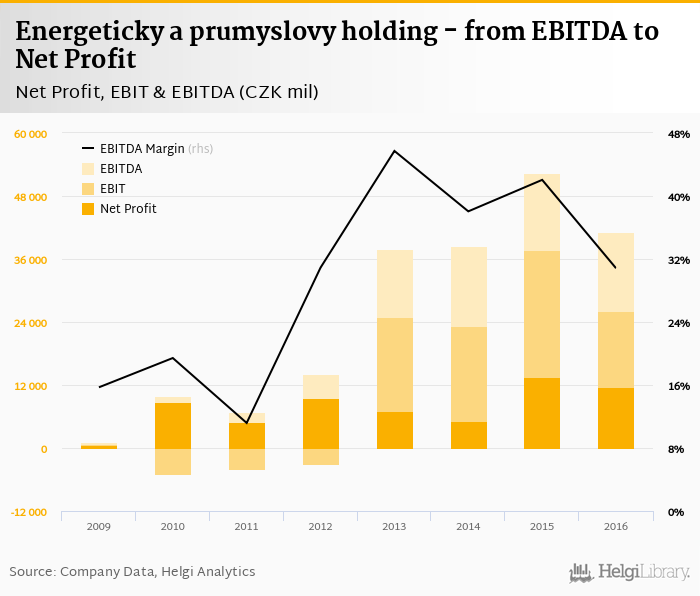 Energeticky a prumyslovy holding made a net profit of CZK 11,651 mil with revenues of CZK 133,300 mil in 2016, down by 13.6% and up by 6.89%, respectively, compared to the previous year. This translates into a net margin of 8.74%.