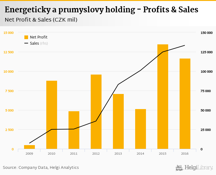 Energeticky a prumyslovy holding made a net profit of CZK 11,651 mil in 2016, down 13.6% compared to the previous year. Total sales reached CZK 133,300 mil, which is up 6.89% when compared to the previous year.