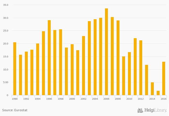 Historically, energy dependence in natural gas in Romania reached an all time high of 33.7% in 2006 and an all time low of 1.80% in 2015.