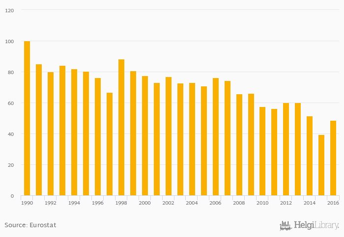 Historically, energy dependence in petroleum products in Estonia reached an all time high of 100% in 1990 and an all time low of 39.4% in 2015.