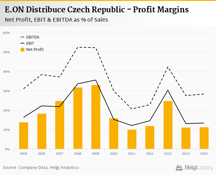 E.ON Distribuce Czech Republic made a net profit of CZK 2,132 mil with revenues of CZK 18,908 mil in 2015, up by 1.39% and down by 0.134%, respectively, compared to the previous year.