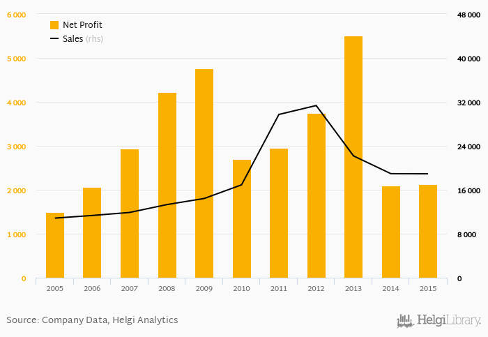 Sales have grown by 5.72% a year on average since 2005. They reached a high of CZK 31,334 mil in 2012 and a low of CZK 10,844 mil in 2005.