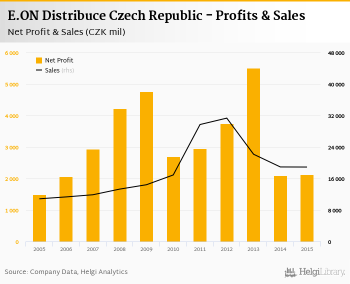 E.ON Distribuce Czech Republic made a net profit of CZK 2,132 mil in 2015, up 1.39% compared to the previous year. Total sales reached CZK 18,908 mil, which is down 0.134% when compared to the previous year.