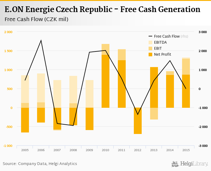 The company generated cash, defined by a sum of net profit and depreciation, of CZK 1,749 mil or 3.28% of sales. When investments are excluded, free cash flow reached CZK -21.7 mil, or -0.041% of sales in 2015.