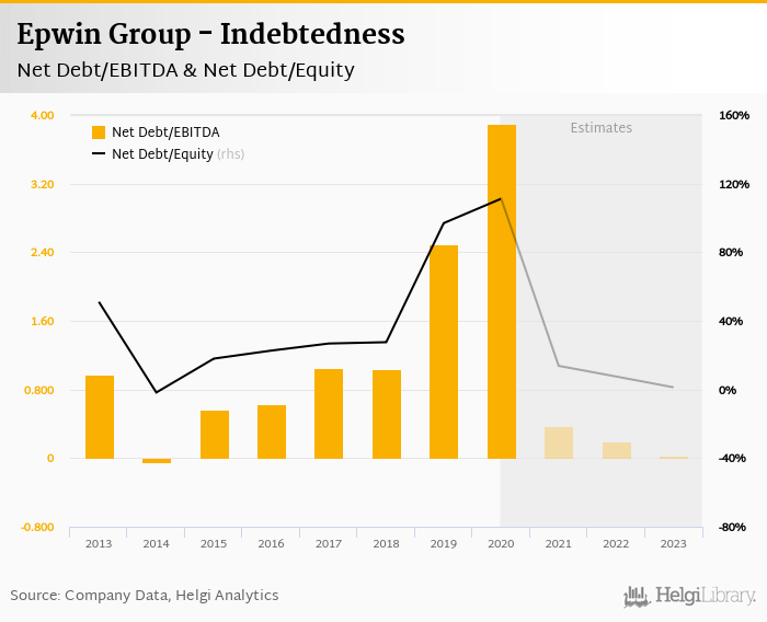 Epwin Group's net debt stood at GBP 99.3 mil and accounted for 111% of equity at the end of 2020. The ratio is up 14.2 pp compared to the previous year.