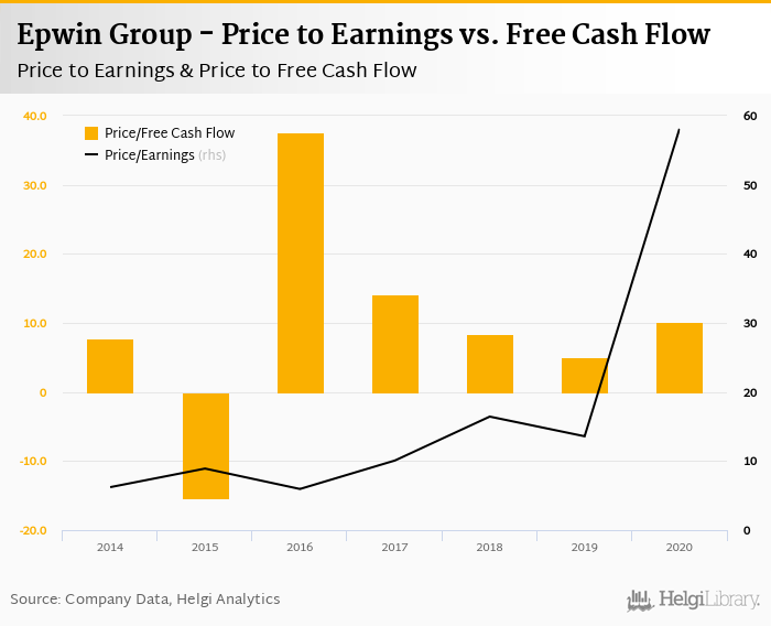 Regarding cash generated defined by the sum of net profit and depreciation, the stock traded at 7.91x at the end of 2020. When investments are excluded to get free cash flow, Epwin Group traded at 10.1x.