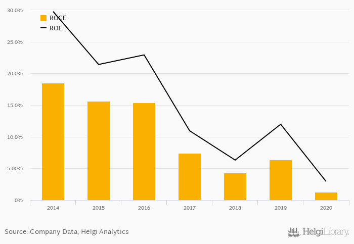 The result implies a return on equity of 2.92% and a return on invested capital of 1.27% in 2020. That is compared to an average of 11.0% and 6.96% over the last five years.