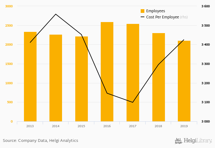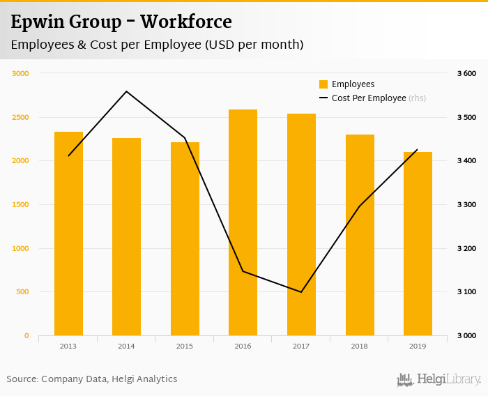 Epwin Group employed 2,103 employees in 2019, down 8.72% compared to the previous year. Historically, between 2012 and 2019, the firm's workforce hit a high of 2,592 employees in 2016 and a low of 2,103 employees in 2019.