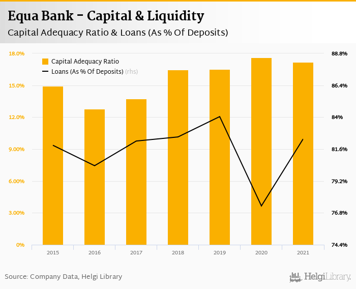 Equa Bank's capital adequacy ratio reached 17.2% at the end of 2021, down from 17.6% compared to the previous year. Historically, the bank’s capital ratio hit an all time high of 17.6% in 2020 and an all time low of 12.8% in 2016.