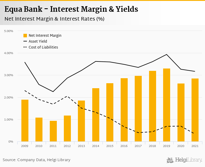 Equa Bank's net interest margin amounted to 2.86% in 2021, up from 2.63% compared to the previous year.