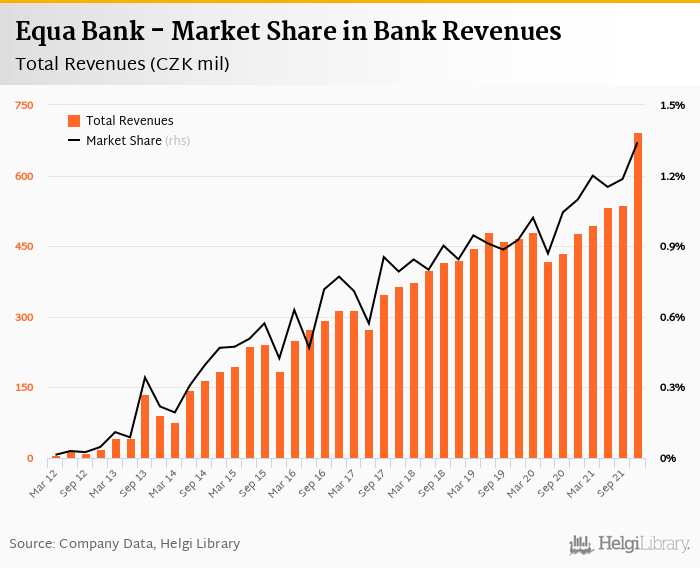 Equa Bank generated total banking revenues of CZK 692 mil in 2021-12-31, up 28.9% compared to the previous year.