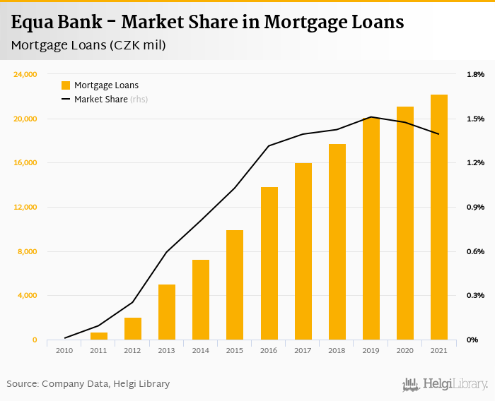 Equa Bank's mortgage loans reached CZK 22,212 mil in 2021, up 5.02% compared to the previous year.