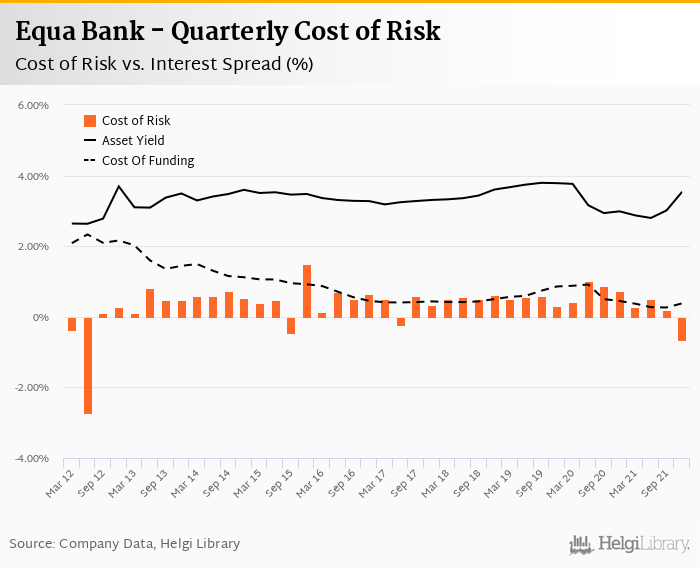 Equa Bank's Cost of Risk (loan loss provisions as % of total assets) amounted to -0.645% in the fourth quarter of 2021, down from 0.203% when compared to the previous quarter.