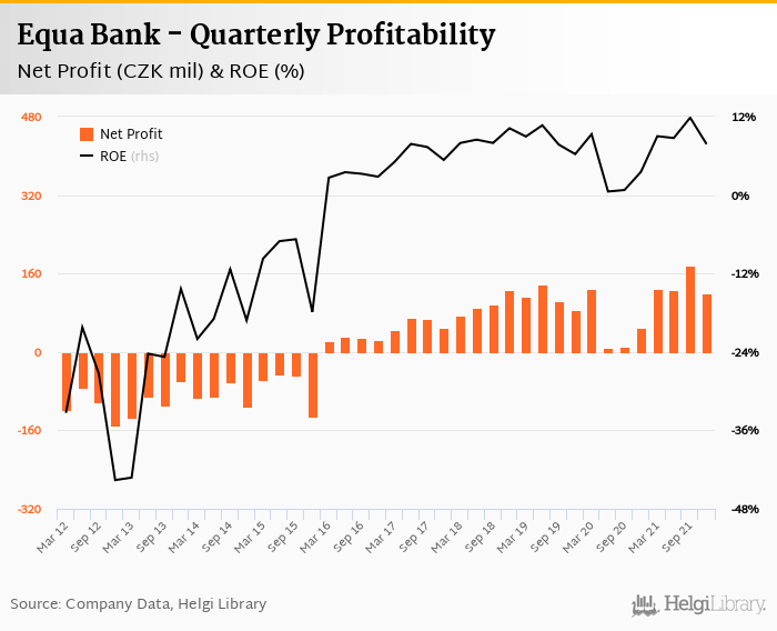 Equa Bank made a net profit of CZK 120 mil in the fourth quarter of 2021, up 140% when compared to the same period of last year. This implies a return on equity of 7.79%.