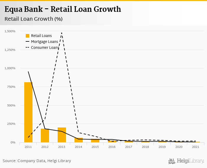 Equa Bank's retail loans reached CZK 40,785 mil at the end of 2021, up 10.5% compared to the previous year. In the last decade, the average annual loan growth amounted to 49.2%.