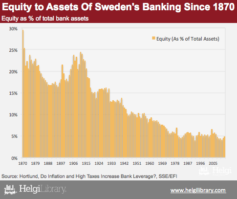 From nearly 30% in 1870, bank equity dropped to less than 5% of bank assets in Sweden, according to a study made by Per Hortlund (Do Inflation and High Taxes Increase Bank Leverage?) The situation is similar in most developed countries in the world now. Following the financial crisis, hefty losses in the banking sectors across the world and tightening regulation calling for capital strenghtening, it will be interesting to watch where the capital level will go. One thing is sure, though, it will go up...