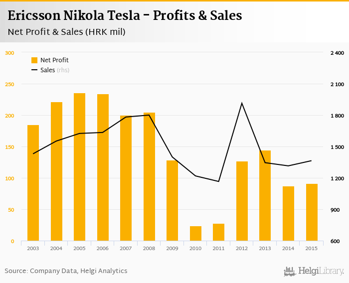 Ericsson Nikola Tesla made a net profit of HRK 91.4 mil in 2015, up 4.58% compared to the previous year. Total sales reached HRK 1,364 mil, which is up 3.76% when compared to the previous year.