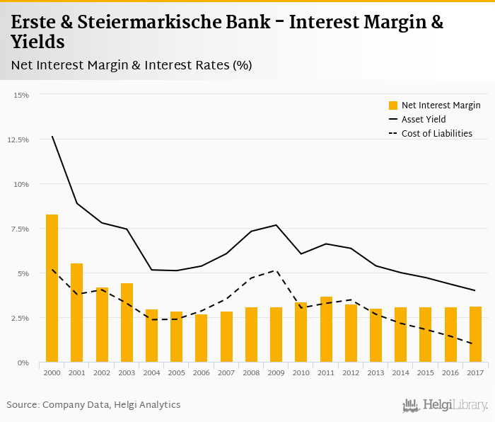 Erste & Steiermarkische Bank's net interest margin amounted to 3.15% in 2017, up from 3.08% compared to the previous year.