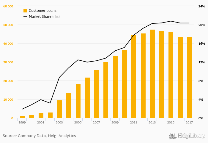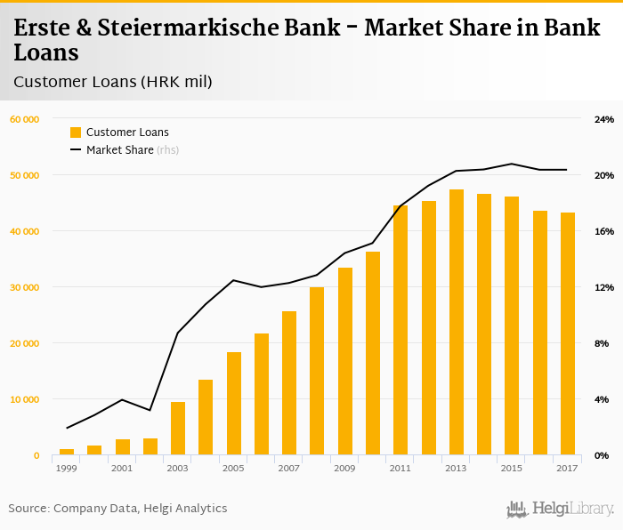 Erste & Steiermarkische Bank accounted for 20.3% of all customer loans issued in Croatia at the end of 2017. Historically, the bank’s market share in customer loans reached an all time high of 20.7% in 2015 and an all time low of 1.87% in 1999.