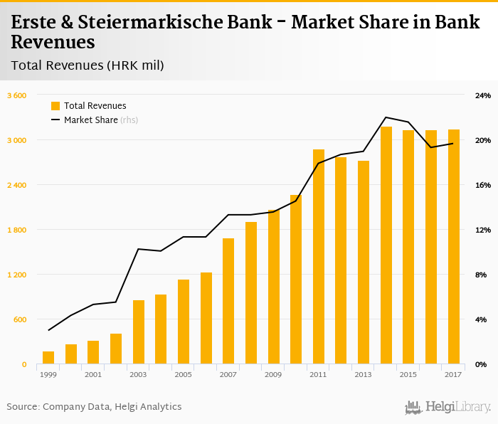 As a result, Erste & Steiermarkische Bank accounted for 19.6% of all bank revenues generated by banks in Croatia in 2017. Historically, the bank’s market share in total revenues reached an all time high of 22.0% in 2014 and an all time low of 2.95% in 1999.