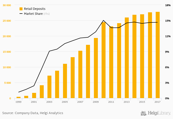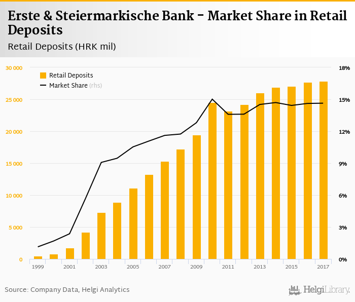 Erste & Steiermarkische Bank accounted for 14.6% of all retail deposits taken by banks in Croatia at the end of 2017. Historically, the bank’s market share in retail deposits reached an all time high of 15.0% in 2010 and an all time low of 1.14% in 1999.