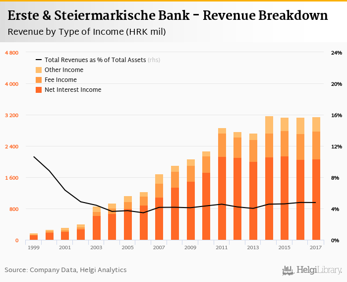 Comparing Erste & Steiermarkische Bank with its closest peers, Zagrebacka Banka generated total revenues of 4.30% of assets in 2017, Splitska Banka operated with 4.20% revenue margin and Privredna Banka Zagreb produced total income worth 4.77% of assets.