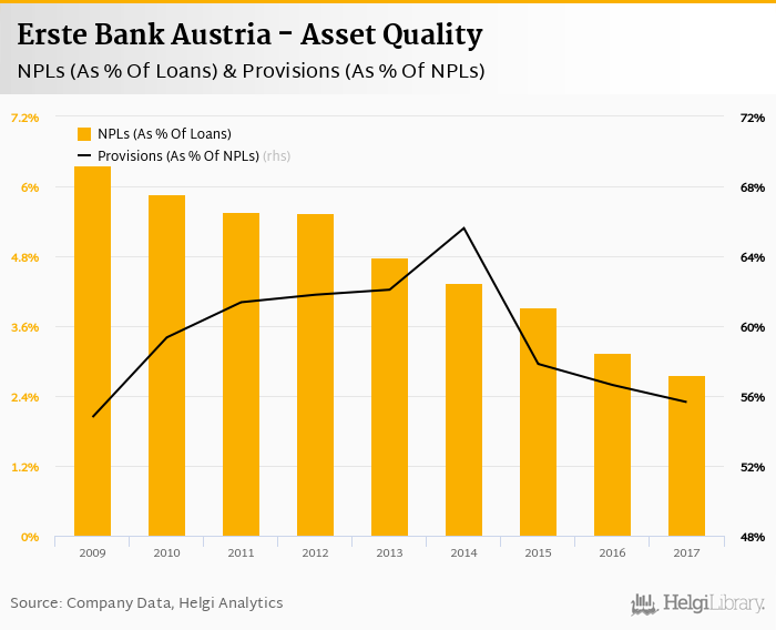 Erste Bank Austria's non-performing loans reached 2.77% of total loans at the end of 2017, down from 3.15% compared to the previous year. Historically, the NPL ratio hit an all time high of 6.36% in 2009 and an all time low of 2.77% in 2017.