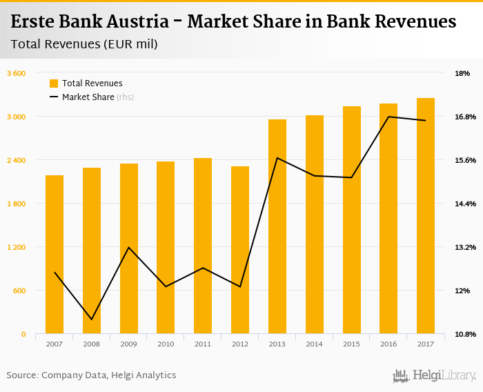 As a result, Erste Bank Austria accounted for 16.7% of all bank revenues generated by banks in Austria in 2017. Historically, the bank’s market share in total revenues reached an all time high of 16.8% in 2016 and an all time low of 11.2% in 2008.