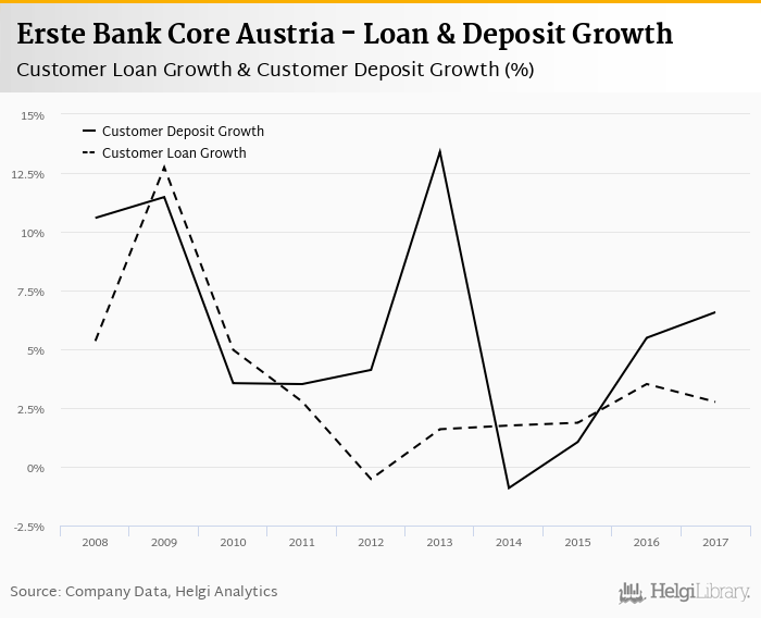 Erste Bank Core Austria's customer loan growth reached 2.76% in 2017, down from 3.52% compared to the previous year. Historically, the bank’s loans growth reached an all time high of 12.7% in 2009 and an all time low of -0.523% in 2012. In the last decade, the average annual loan growth amounted to 0%.