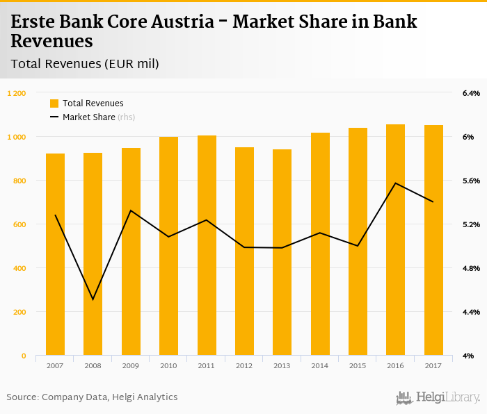 Erste Bank Core Austria generated total banking revenues of EUR 1,054 mil in 2017, down 0.357% compared to the previous year.