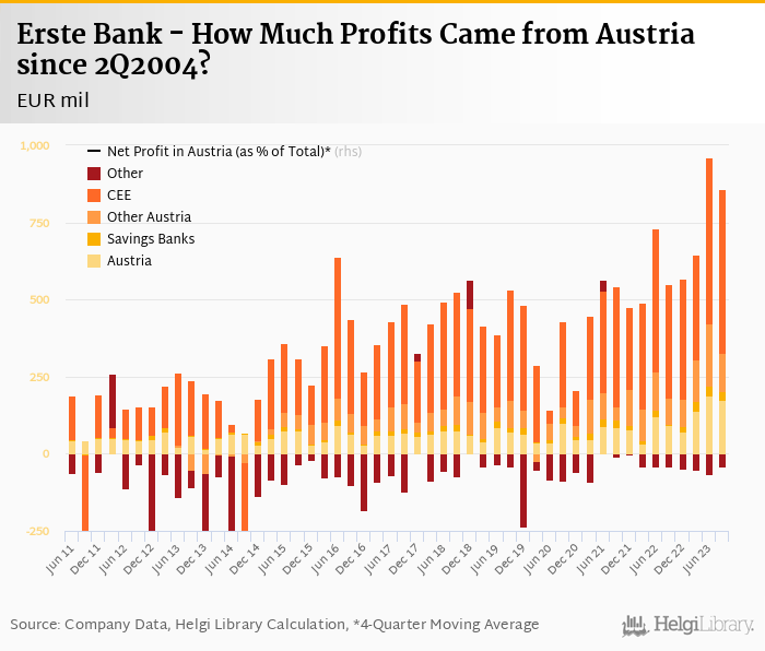 Some 50.5% of the group's net profit came from CEE Region and 31.2% from the Austria. Ceska Sporitelna generated a profit of EUR 198 mil (or 18.8% of total) followed by Erste Austria (EUR 174 mil) and Other Austria (EUR 123 mil).