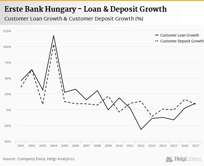 Erste Bank Hungary's customer loan growth reached 10.0% in 2017, up from 2.30% compared to the previous year. Historically, the bank’s loans growth reached an all time high of 117% in 2004 and an all time low of -31.4% in 2012. In the last decade, the average annual loan growth amounted to -2.65%.