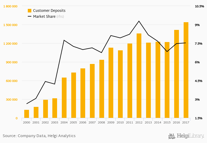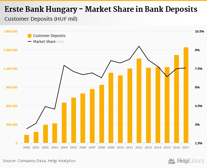 Erste Bank Hungary accounted for 7.53% of all customer deposits taken by banks in Hungary at the end of 2017. Historically, the bank’s market share in customer deposits reached an all time high of 9.28% in 2012 and an all time low of 2.63% in 2000.