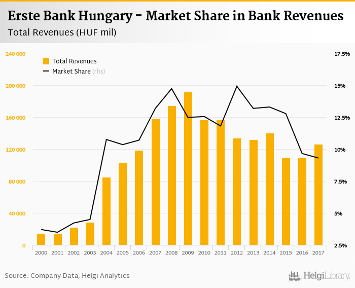 As a result, Erste Bank Hungary accounted for 9.30% of all bank revenues generated by banks in Hungary in 2017. Historically, the bank’s market share in total revenues reached an all time high of 14.9% in 2012 and an all time low of 3.49% in 2001.