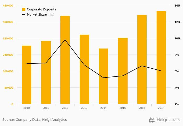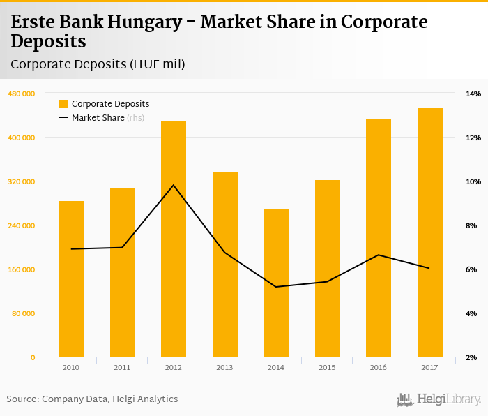 Erste Bank Hungary accounted for 6.02% of all corporate deposits taken by banks in Hungary at the end of 2017. Historically, the bank’s market share in corporate deposits reached an all time high of 9.80% in 2012 and an all time low of 5.17% in 2014.