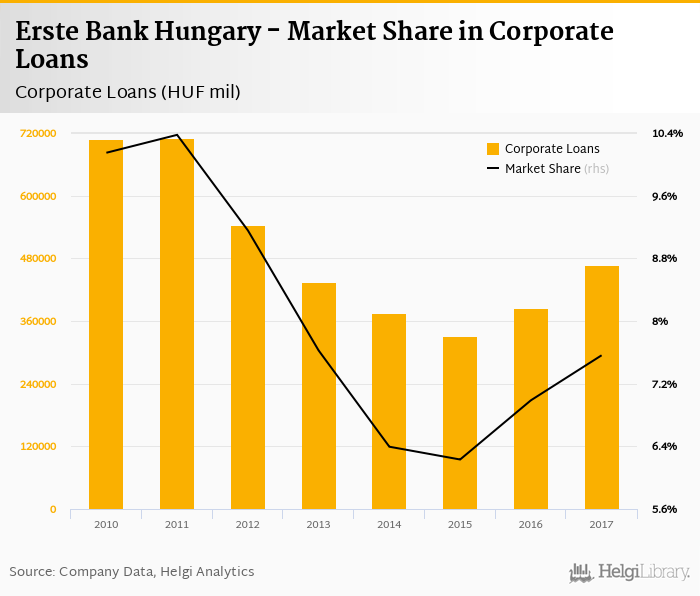 Erste Bank Hungary accounted for 7.56% of all corporate loans issued in Hungary at the end of 2017. Historically, the bank’s market share in corporate loans reached an all time high of 10.4% in 2011 and an all time low of 6.23% in 2015.
