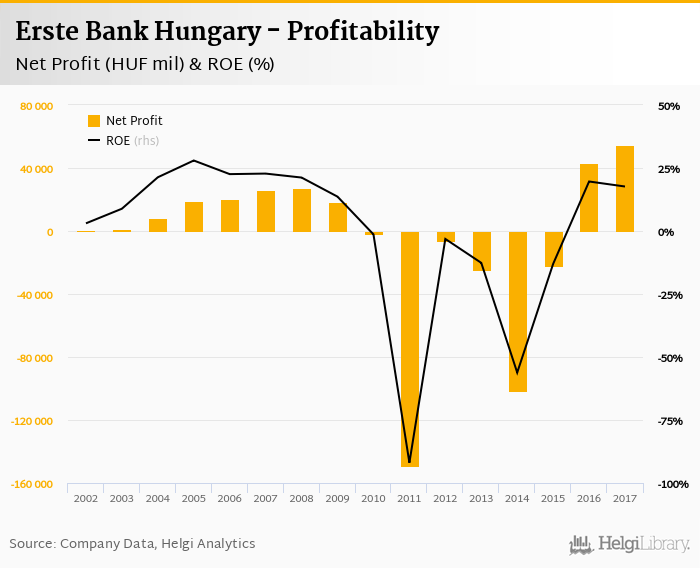 Erste Bank Hungary made a net profit of HUF 54,754 mil in 2017, up 26.3% compared to the previous year. This implies a return on equity of 17.7%.