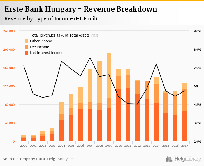 Comparing Erste Bank Hungary with its closest peers, OTP Group generated total revenues of 6.54% of assets in 2017, K&H Bank operated with 4.86% revenue margin and MKB Bank produced total income worth 3.85% of assets.