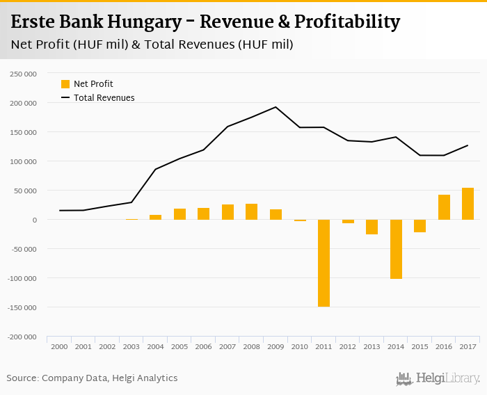 Erste Bank Hungary made a net profit of HUF 54,754 mil under revenues of HUF 126,281 mil in 2017, up 26.3% and 15.9% respectively compared to the previous year.