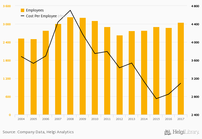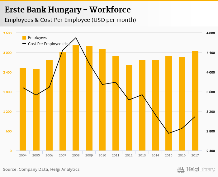 Erste Bank Hungary employed 3,047 persons in 2017, up 6.06% when compared to the previous year. Historically, the bank's workforce hit an all time high of 3,230 persons in 2008 and an all time low of 2,505 in 2005.
