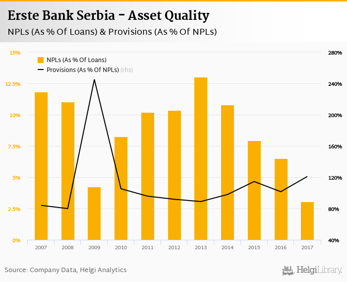 Comparing Erste Bank Serbia with its closest peers, Komercijalna Banka Beograd operated at the end of 2017 with NPL ratio of 15.7% and provision coverage of 69.4%, Bank Intesa Serbia with 9.25% and 51.5% respectively and Raiffeisenbank Serbia had 4.74% of bad loans covered with 95.5% by provisions at the end of 2017.
