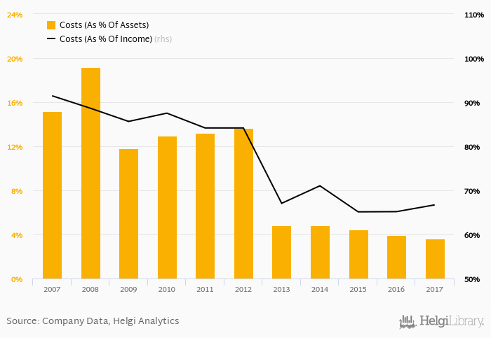 Historically, the bank’s costs reached an all time high of 91.4% of income in 2007 and an all time low of 65.1% in 2015.