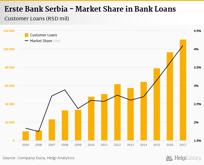 Erste Bank Serbia's customer loans reached RSD 110,473 mil in 2017, up 14.5% compared to the previous year.