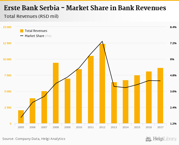As a result, Erste Bank Serbia accounted for 4.37% of all bank revenues generated by banks in Serbia in 2017. Historically, the bank’s market share in total revenues reached an all time high of 7.31% in 2012 and an all time low of 1.63% in 2005.