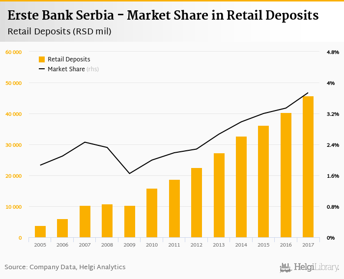 Erste Bank Serbia accounted for 3.74% of all retail deposits taken by banks in Serbia at the end of 2017. Historically, the bank’s market share in retail deposits reached an all time high of 3.74% in 2017 and an all time low of 1.65% in 2009.
