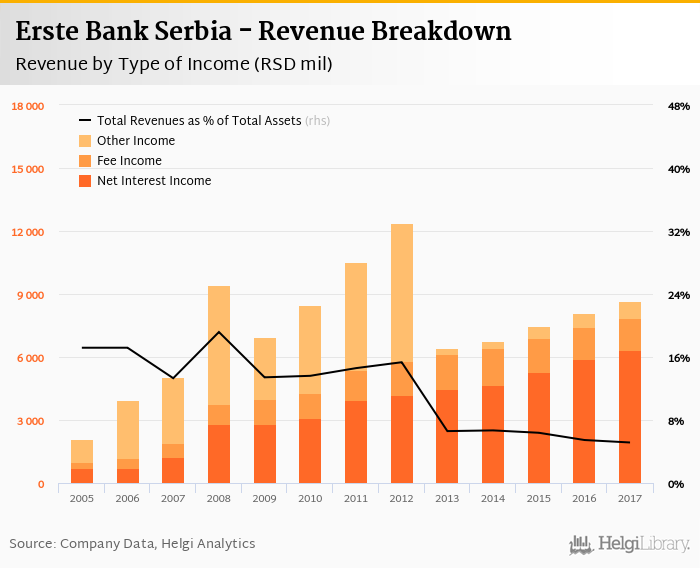 Comparing Erste Bank Serbia with its closest peers, Komercijalna Banka Beograd generated total revenues of 5.43% of assets in 2017, Bank Intesa Serbia operated with 5.33% revenue margin and Raiffeisenbank Serbia produced total income worth 5.87% of assets.