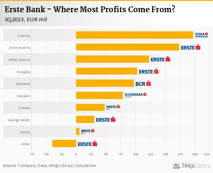Some 50.5% of the group's net profit came from CEE Region and 31.2% from the Austria. Ceska Sporitelna generated a profit of EUR 198 mil (or 18.8% of total) followed by Erste Austria (EUR 174 mil) and Other Austria (EUR 123 mil).