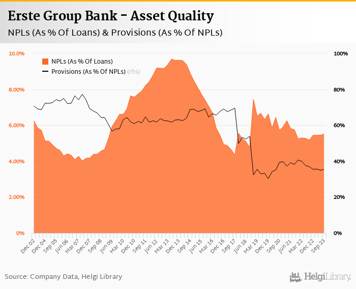 Erste Group Bank's non-performing loans reached 5.52% of total loans at the end of 2023-09-30, up from 5.18% compared to the previous year. Historically, the NPL ratio hit an all time high of 9.69% in 2013-06-30 and an all time low of 4.01% in 2007-06-30.