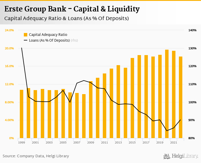 Comparing Erste Group Bank with its closest peers, Raiffeisen Bank Int. ended the year 2022 with a capital adequacy ratio at 20.0% and loans to deposits of 82.5% and PKO BP with 17.8% and 68.2% respectively.